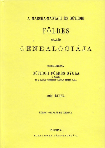 A marcha-magyari és gúthori Földes egy régi Pozsony megyei család, amely eredetét az 1500-as évek legelejéig vezeti vissza. A kötetben a család máig legteljesebb genealógiáját olvashatjuk. összeállította gúthori Földes Gyula. - Pozsony : [Szerző], 1901.