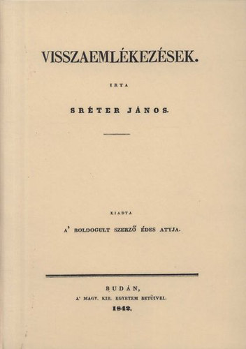A fiatalon elhunyt Sréter János Nógrád megye közigazgatásában tevékenykedett a reformkor éveiben. Visszaemlékezései a tisztviselőként megélt tapasztalatait adja közre, a megye és az ország közgyűléseiről, illetve az általa és barátai által kezdeményezett reformtörekvésekről. A kötet értékes forrása mind Nógrád megye mind az ország reformkori politikatörténetének. Irta Sréter János. [Buda] Budán : a' Magy. Kir. Egyetem betüivel, 1842. Hasonmás kiadás.